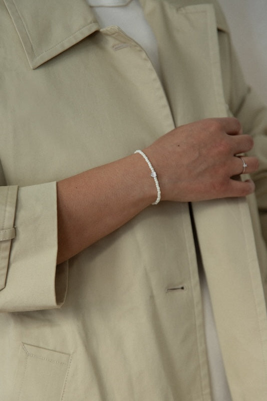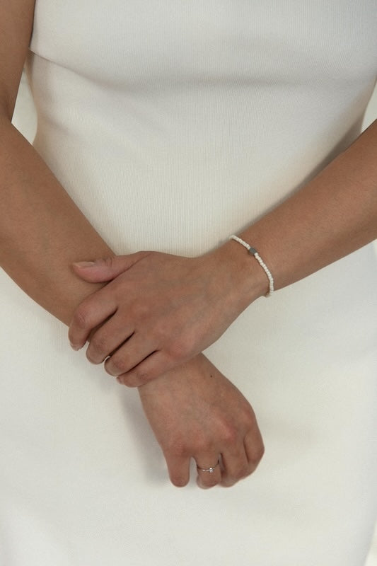 Lasihelmet ja pienet kivet pujotettu elastiseen silikonilankaan, joten korun käyttö helppoa ja se sopii moneen käteen. Pieniä pituuseroja esiintyy, joten kerro lisätietokentässä, haluatko mielummin hieman suuremman vai pienemmän korun.