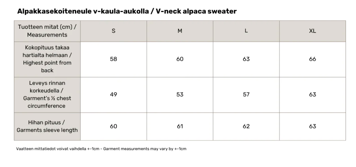 Harjaa säännöllisesti, jotta neuleen pinta säilyy huoliteltuna. Tuuleta neuletta usein raikastamiseksi ja pesutarpeen vähentämiseksi. Jos pesu on tarpeen, suosittelemme kuivapesua tai hellää käsinpesua luonnonkuitujen pesuaineella. Säilytä neule viikattuna, jotta se säilyy kauniina pitkään.