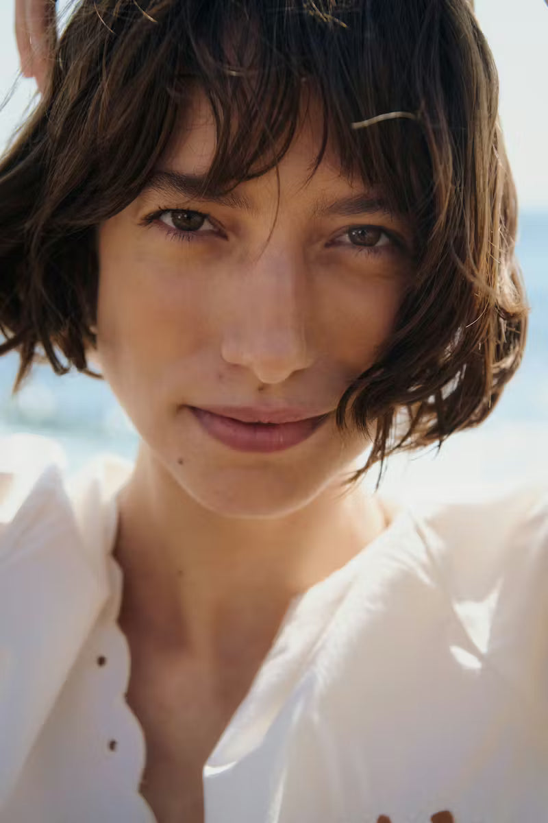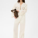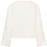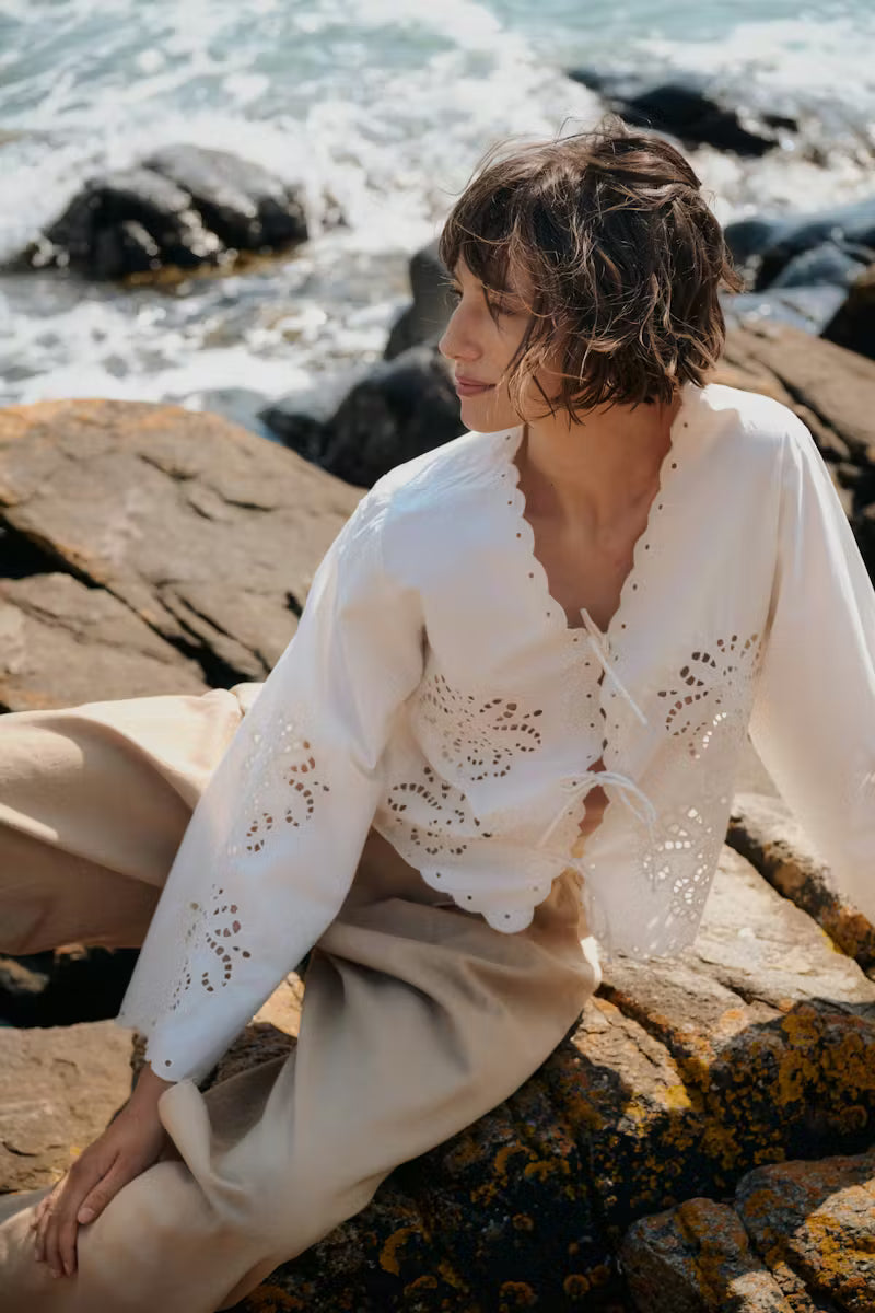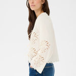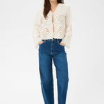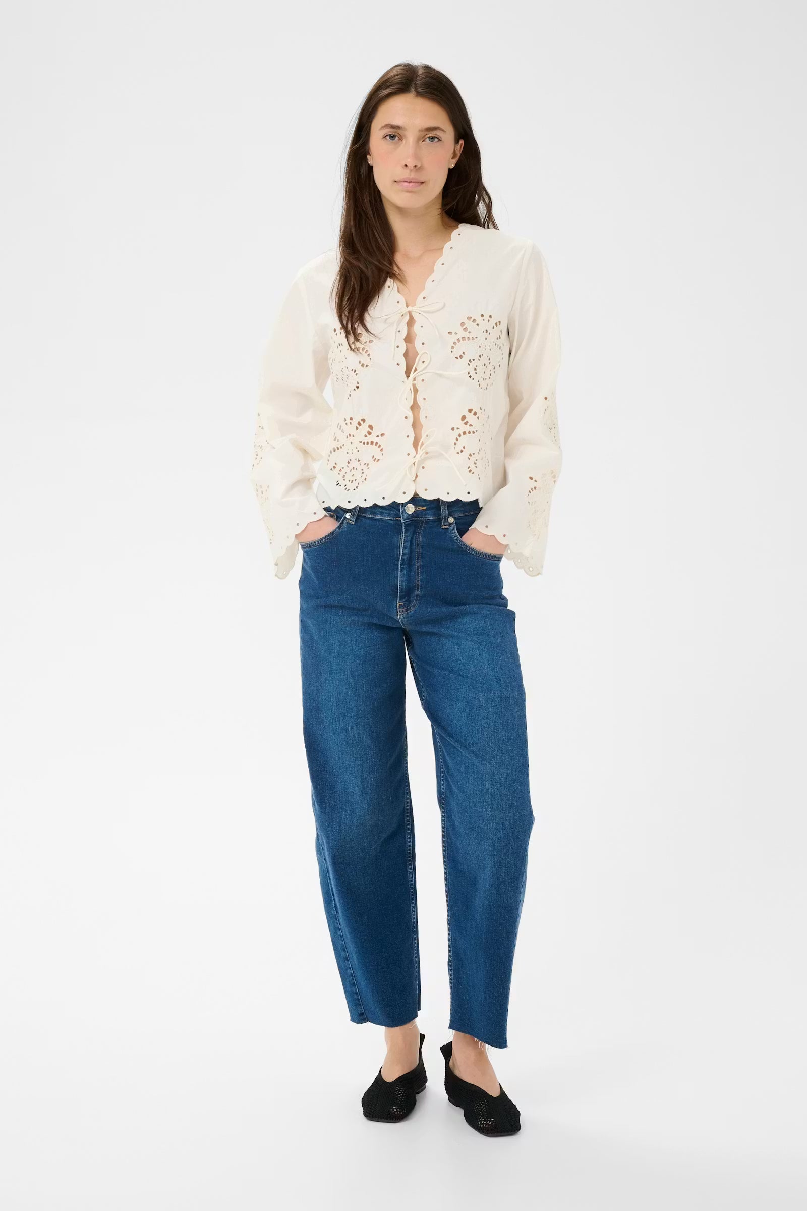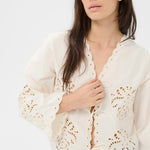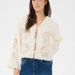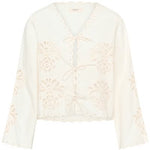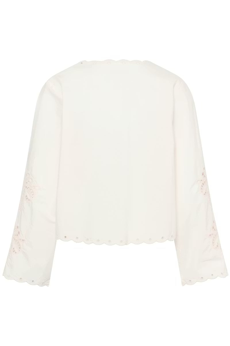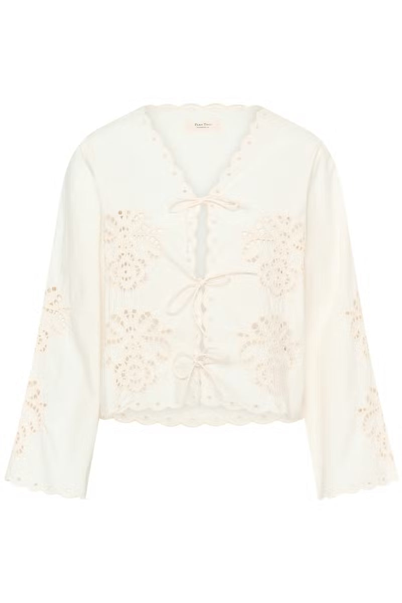Part Twon puuvillainen pusero, jossa solmimisnauhat edessä. Pue alle kevyt toppi tai käytä mekon kanssa jakkumaisesti. Ihana reikäpitsikuviointi ja reunan kuviointi tuovat romanttista ilmettä tälle kepeän kesäisellä puserolle.