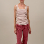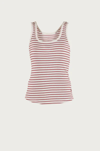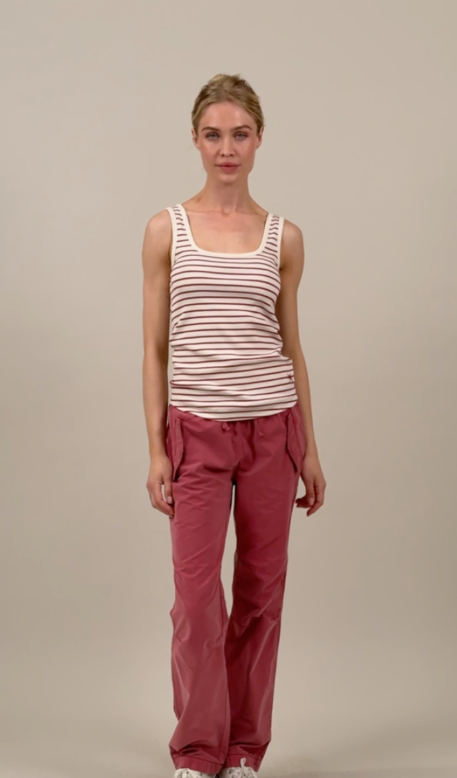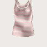 Ihana raitatoppi joustavaa ribbineulosta! Yhdistä saman sarjan trikoohousuihin. Tässä topissa on karpalonpunaiset raidat luonnonvalkoisella pohjalla.