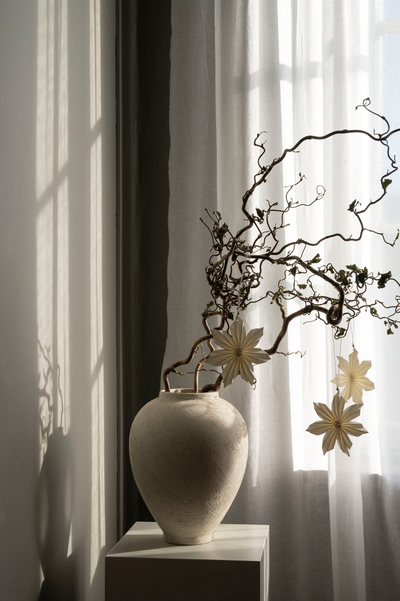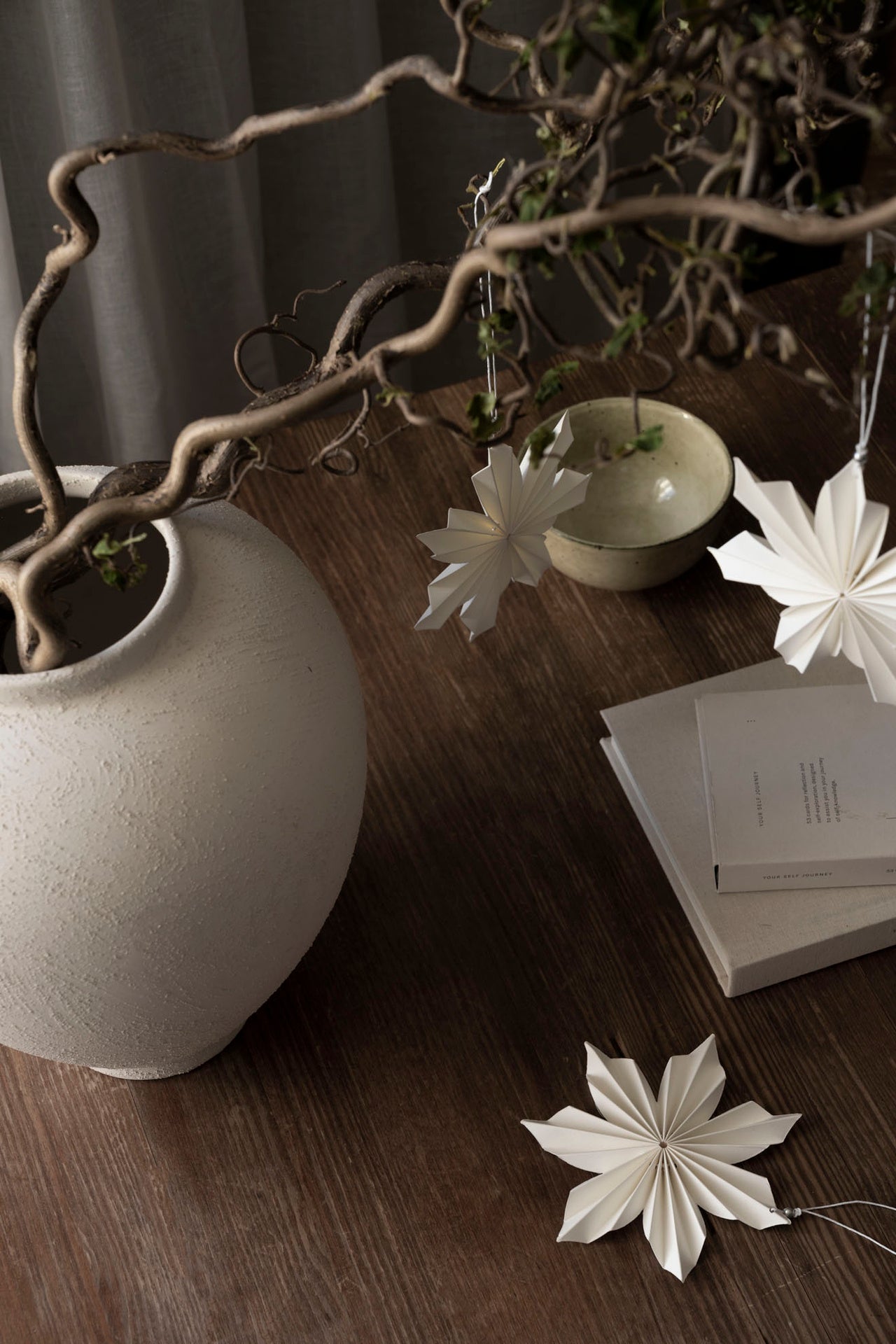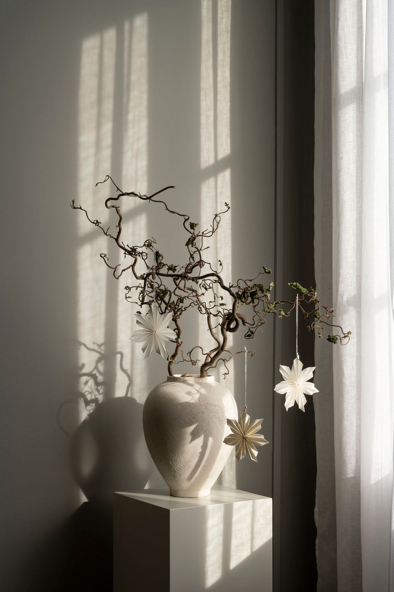 Ripusta oksaan tuomaan ilmettä tai korista joulukuusesi valkoisilla paperitähdillä ja kynttilöillä.