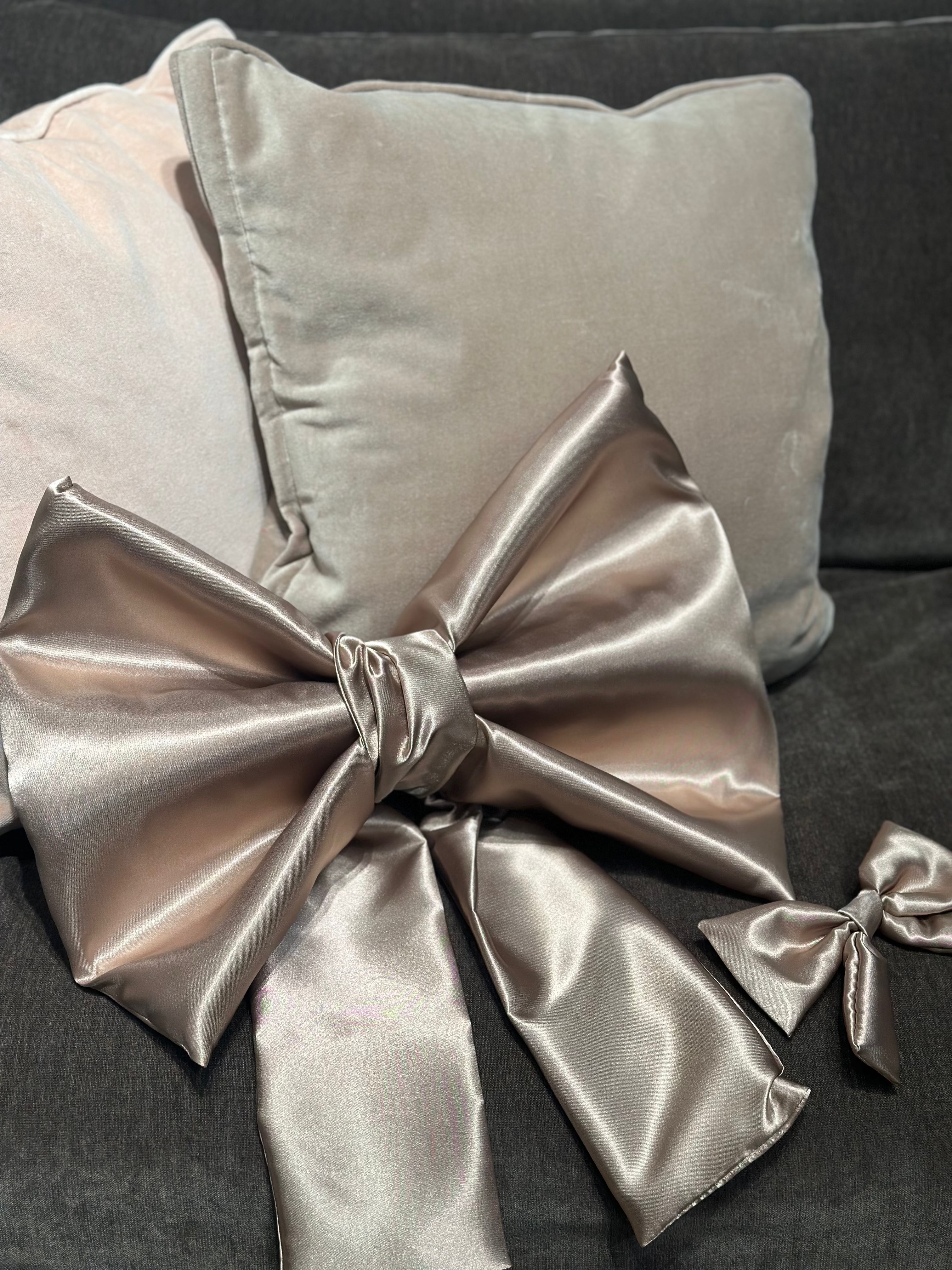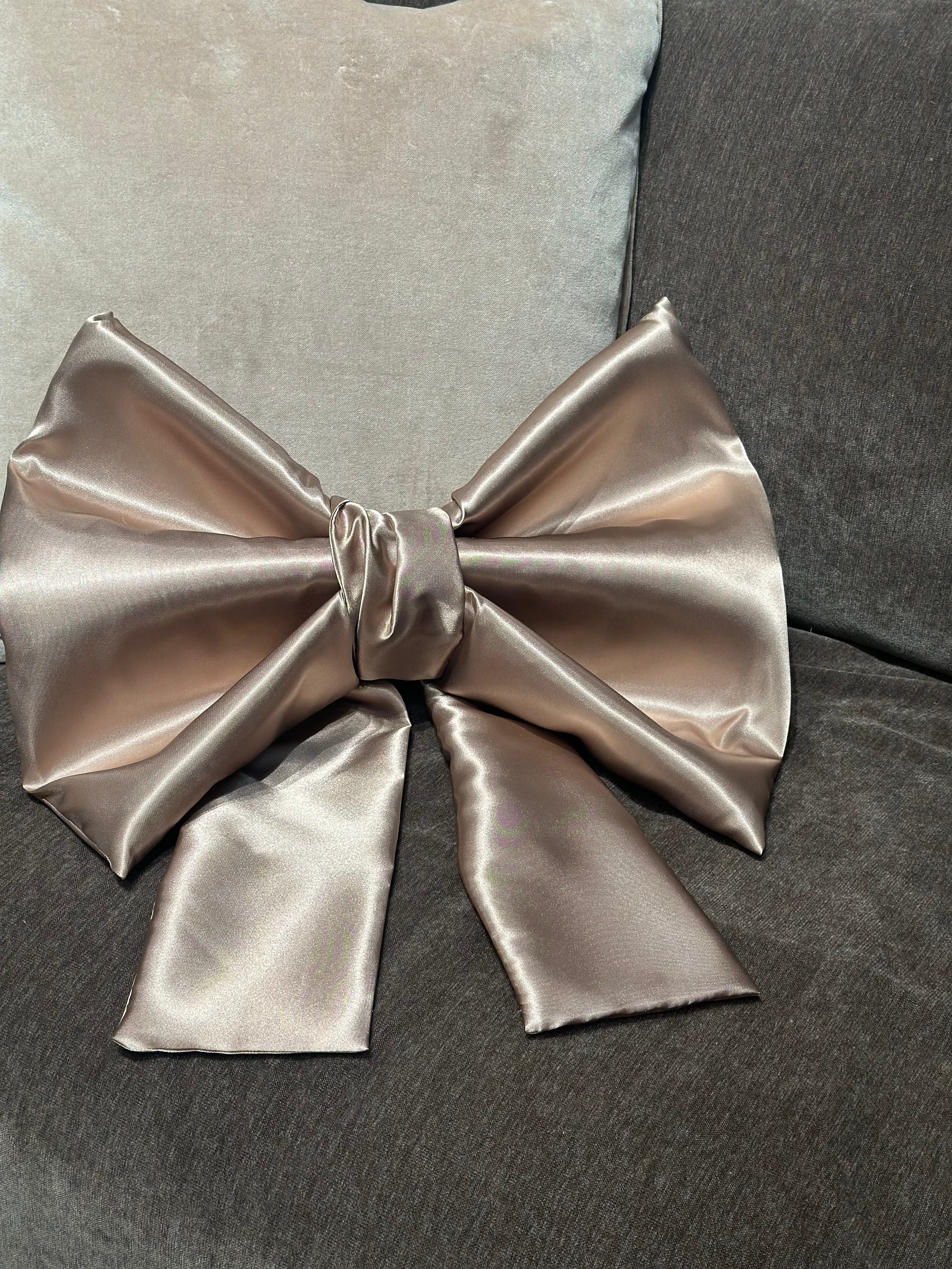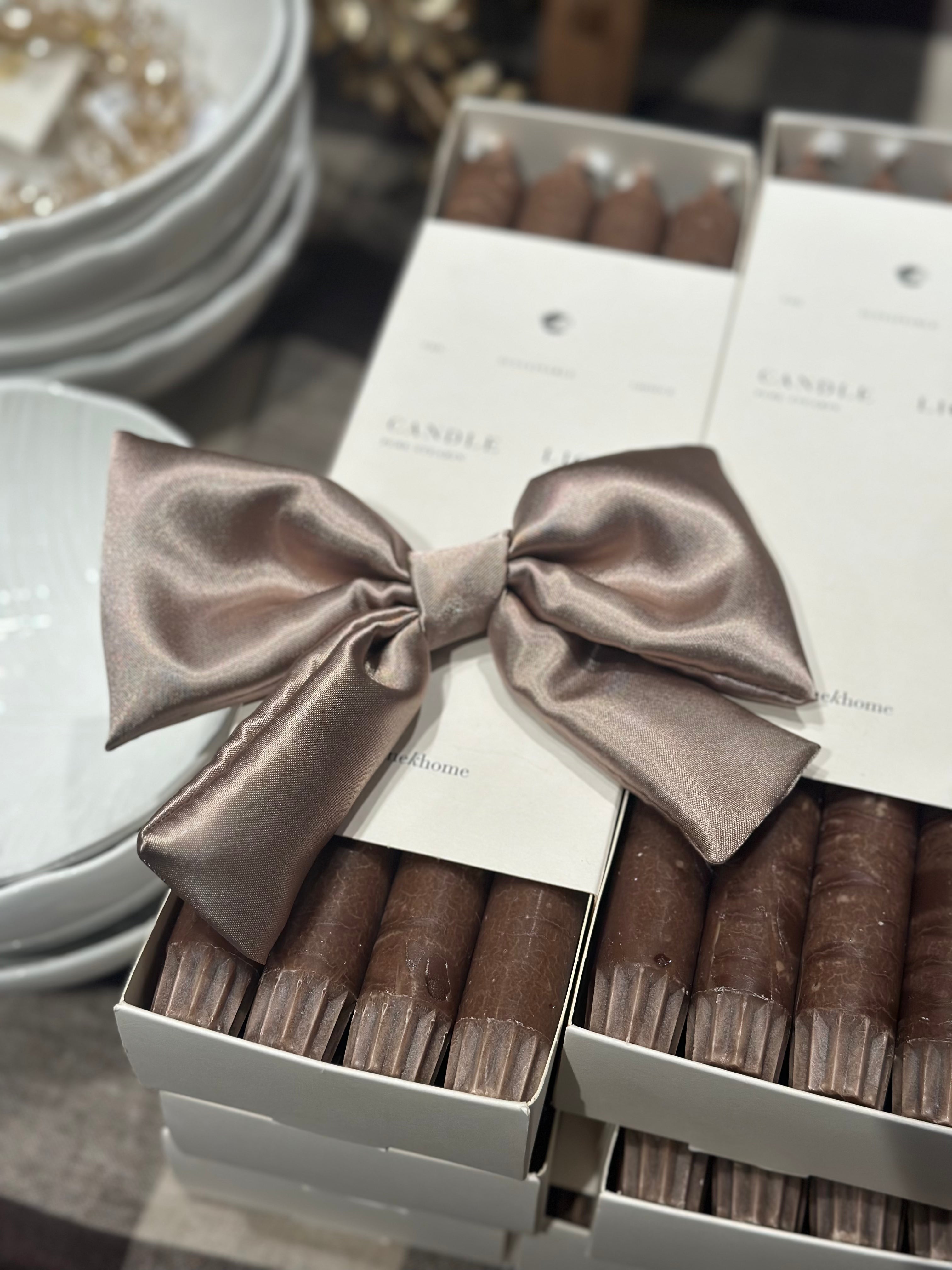 Hillittyä satiinia, klassisen kaunista kiiltävää pintaa, upea nougatin sävy. Tämä suurempi rusetti viimeistelee juhlakattauksen, joulukuusen tai vaikkapa pinnasängyn reunan. Rusetin koko on leveys noin 50cm ja korkeus noin 60cm.