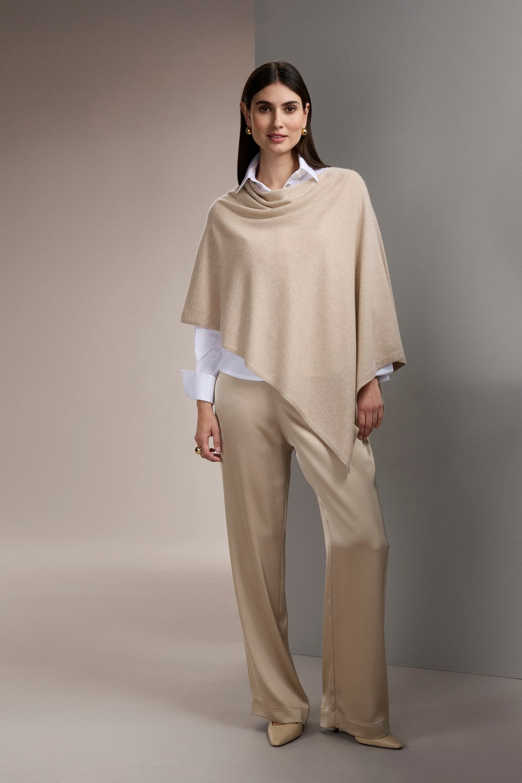 Uutuusponcho on valmistettu hienoimmasta, harjatusta cashmeresta, joka tunnetaan poikkeuksellisesta pehmeydestään ja lämmönsäilytyskyvystään. Materiaalina 100% cashmere tekee ponchosta miellyttävän kevyen, mutta samalla lämpimän kumppanin viileisiin kesäpäiviin.