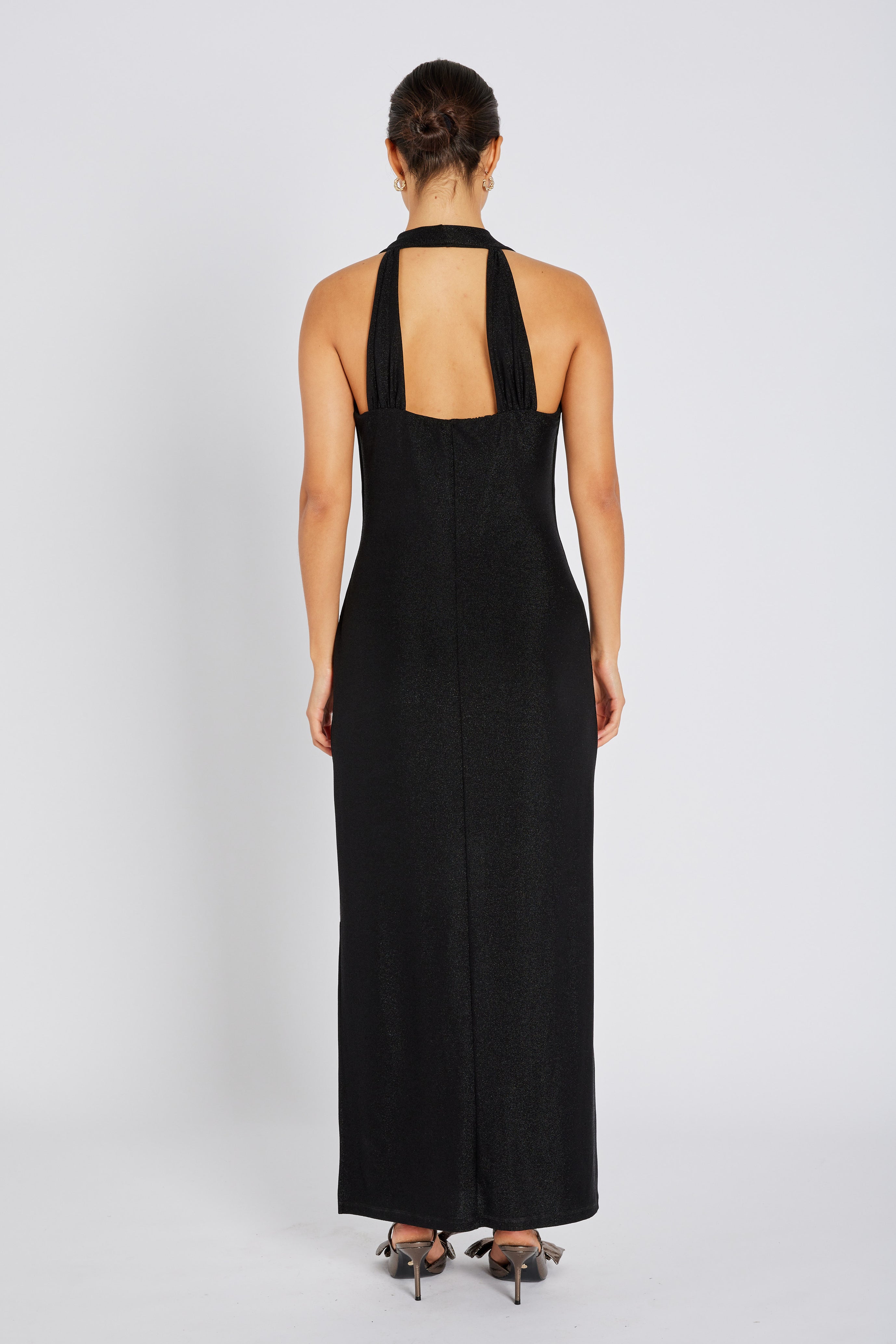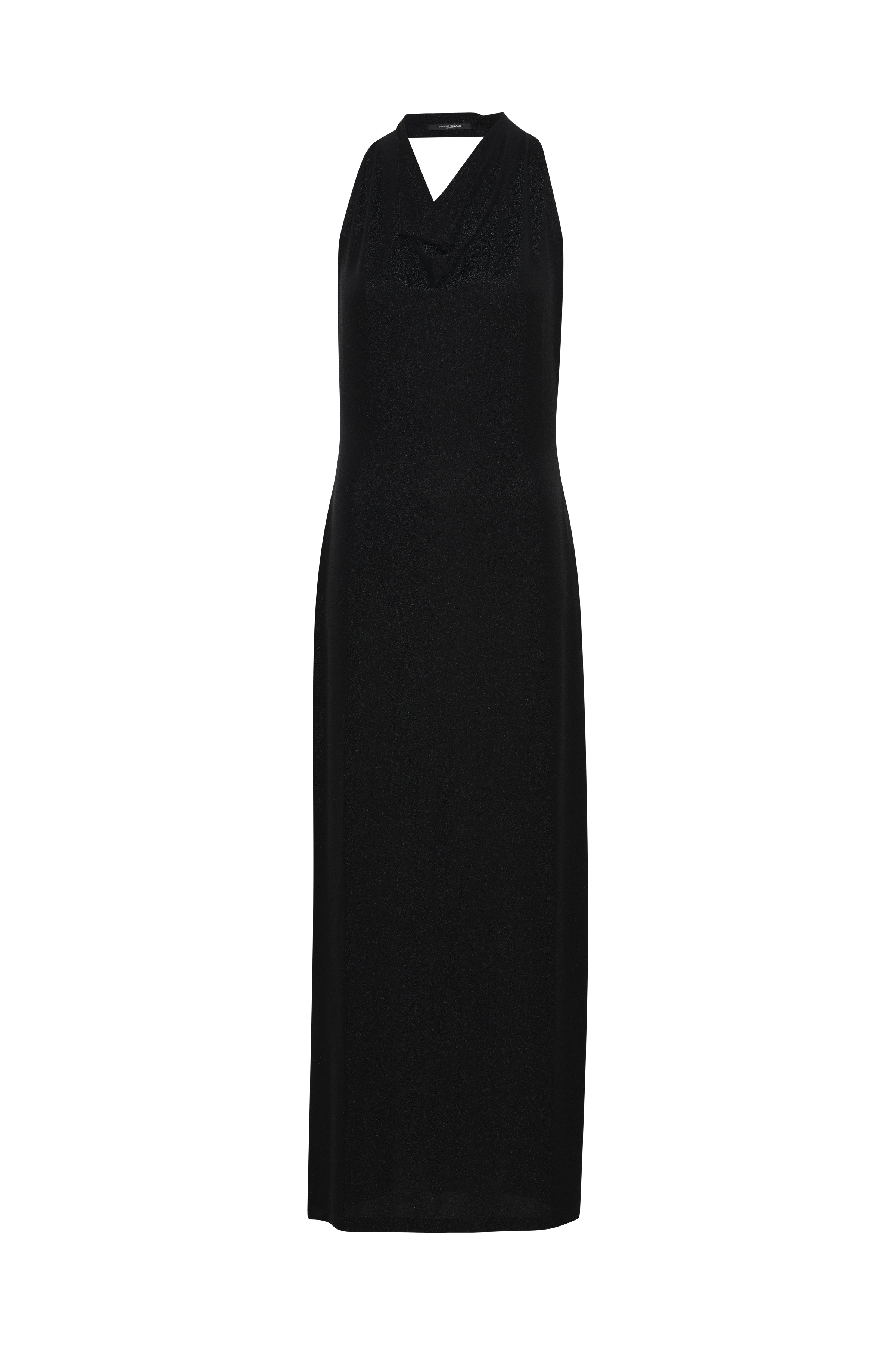Bruuns Bazaarin elegantti, pitkä iltapuku juhlaviin tilaisuuksiin. Tämä upea mekko on ajattoman tyylikäs ja se laskeutuu kauniisti. Mekon korkea kaulus ja vartalonmyötäinen siluetti imartelee käyttäjäänsä. Avonainen selkäosa ja leveät olkaimet luovat selkäpuolelle kauniin kehysmäisen leikkauksen. Kankaassa on metallikuitua, joka tuo mekkoon kauniin kimalteen. Yhdistä korkokenkien ja boleron kanssa näyttävä juhlalook!