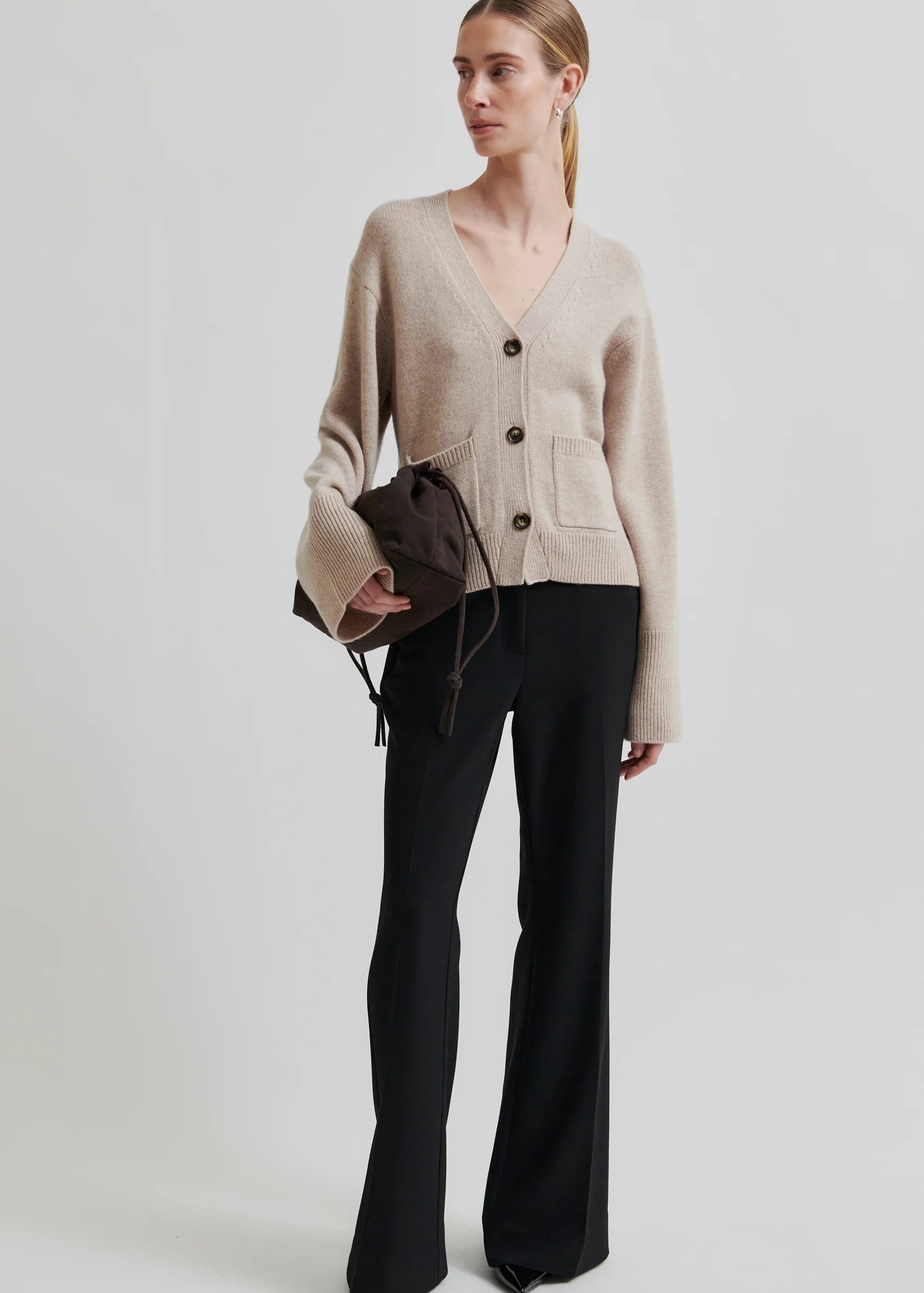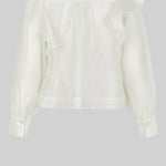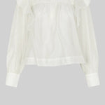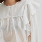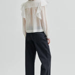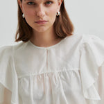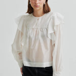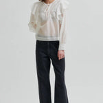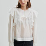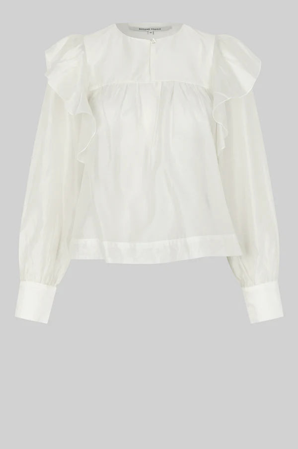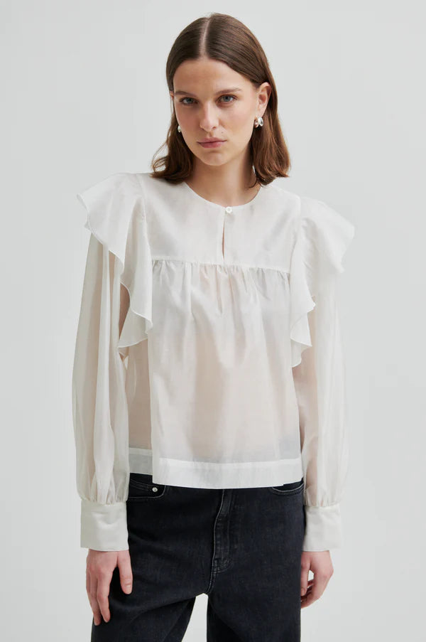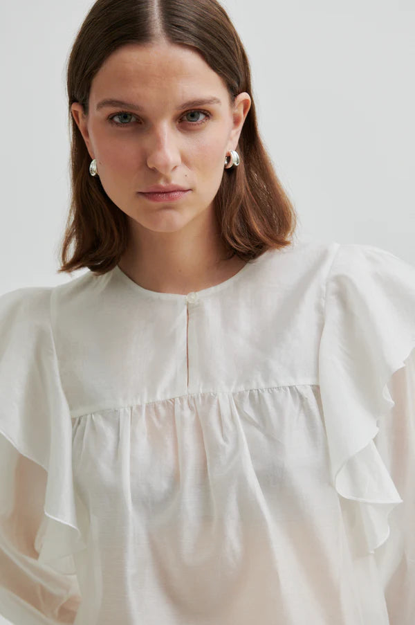 Second Femalen kauniisti laskeutuva röyhelöpusero, jossa kevyet volyymihihat. Edessä yhden napin kiinnitys. Materiaalina pehmeä lyocell-sekoite.