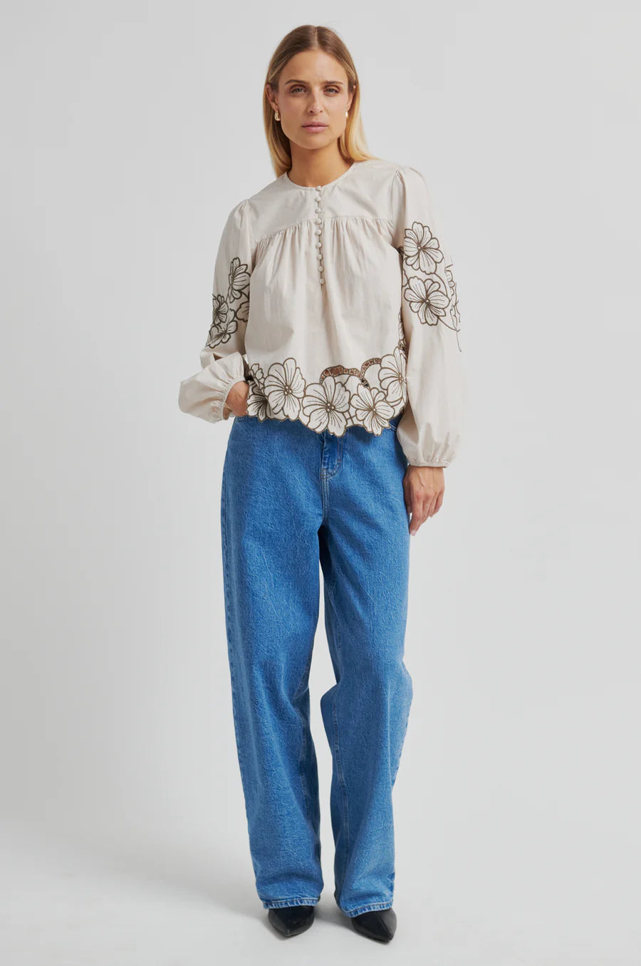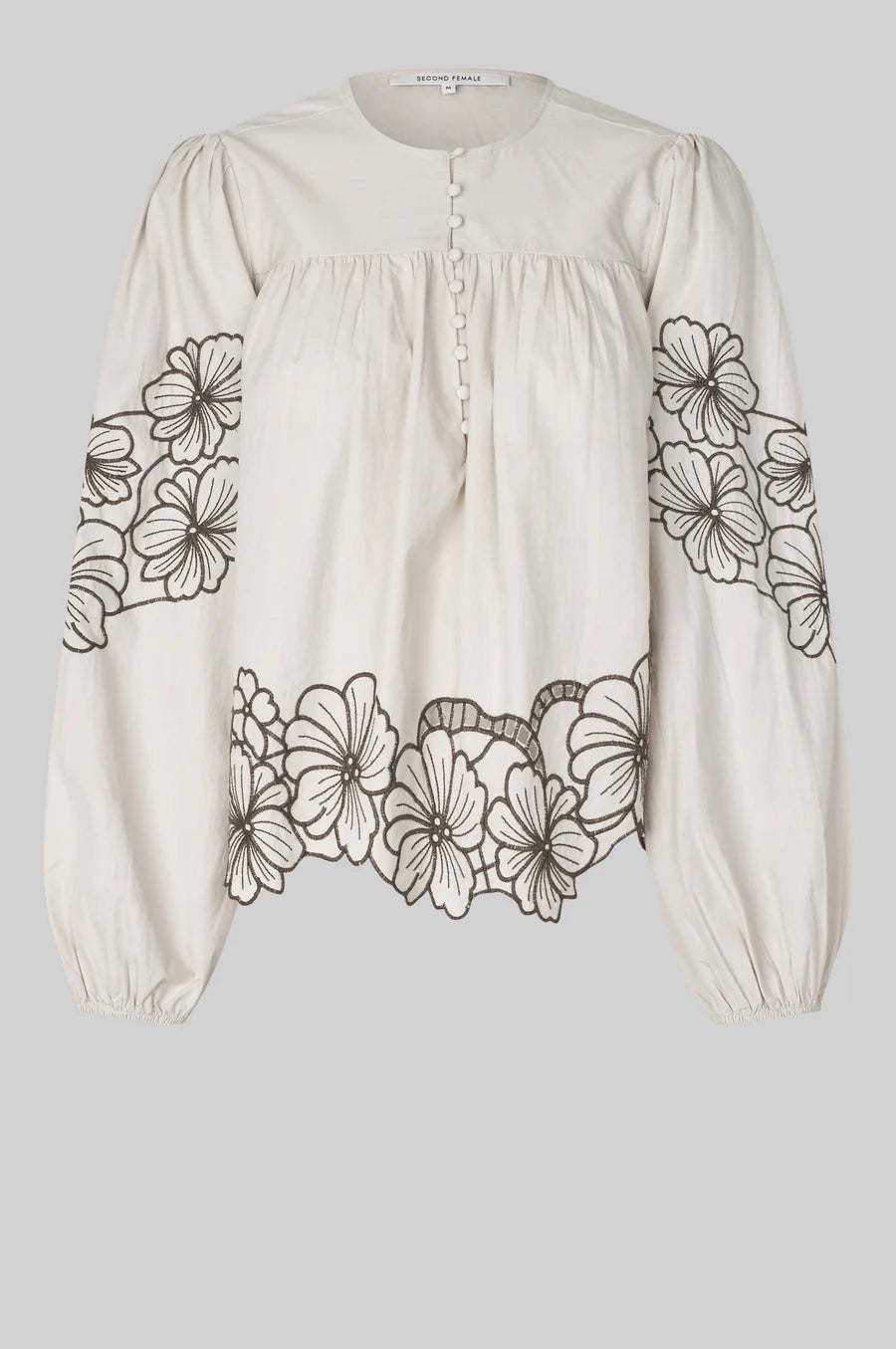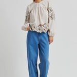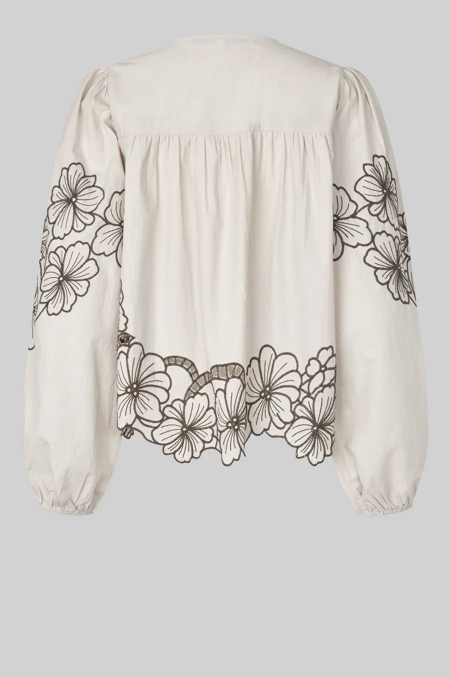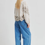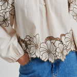 Ihastuttava puuvillapaita, jossa brodeerattuja yksityiskohtia. Pyöreä pääntie ja kuminauhat hihansuissa. Kiva rento, näyttävä malli. Sävynä lämmin beige, brodeeraukset tummemmalla ruskealla.