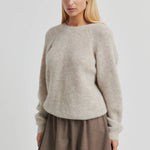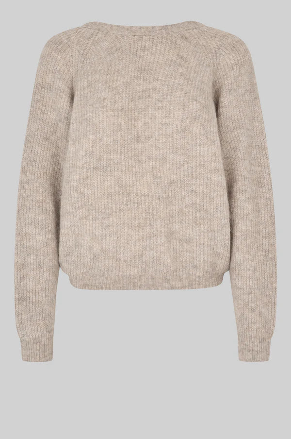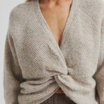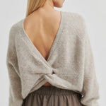 Pehmeästä alpakkasekoitteesta valmistettu neulepusero, jossa jujuna solmu v-kaula-aukossa selkäpuolella. Voit myös kääntää neuleen ja käyttää sitä solmupuoli edessäpäin. Rento malli, joka sopii ihanasti Second Femalen balloon-helmaisen minihameen kanssa, mutta myös vaikkapa lempparifarkkujen kanssa!