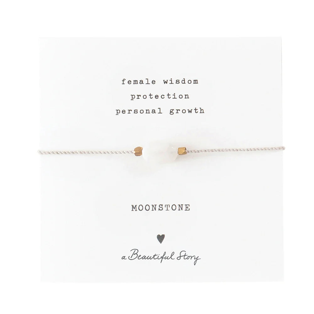 This Gemstone Card Moonstone Gold Colored is a handmade bracelet by A Beautiful Story. It is made of a cotton thread and feaures a moonstone gemstone. The bracelet has a sliding knot of cotton thread.