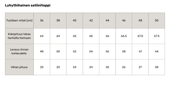 Lyhythihaisessa satiinipaidassa on normaali suora leikkaus ja istutettu hartialinja antavat istuvuutta ja ryhtiä. Rintamuotolaskokset lisäävät istuvuutta, ja sivuhalkiot pyöristetyillä kulmilla sekä hieman pidempi takaosa antavat paidalle modernin ilmeen. Pyöreän kaula-aukon takana on nappikiinnitys kauniina yksityiskohtana.