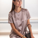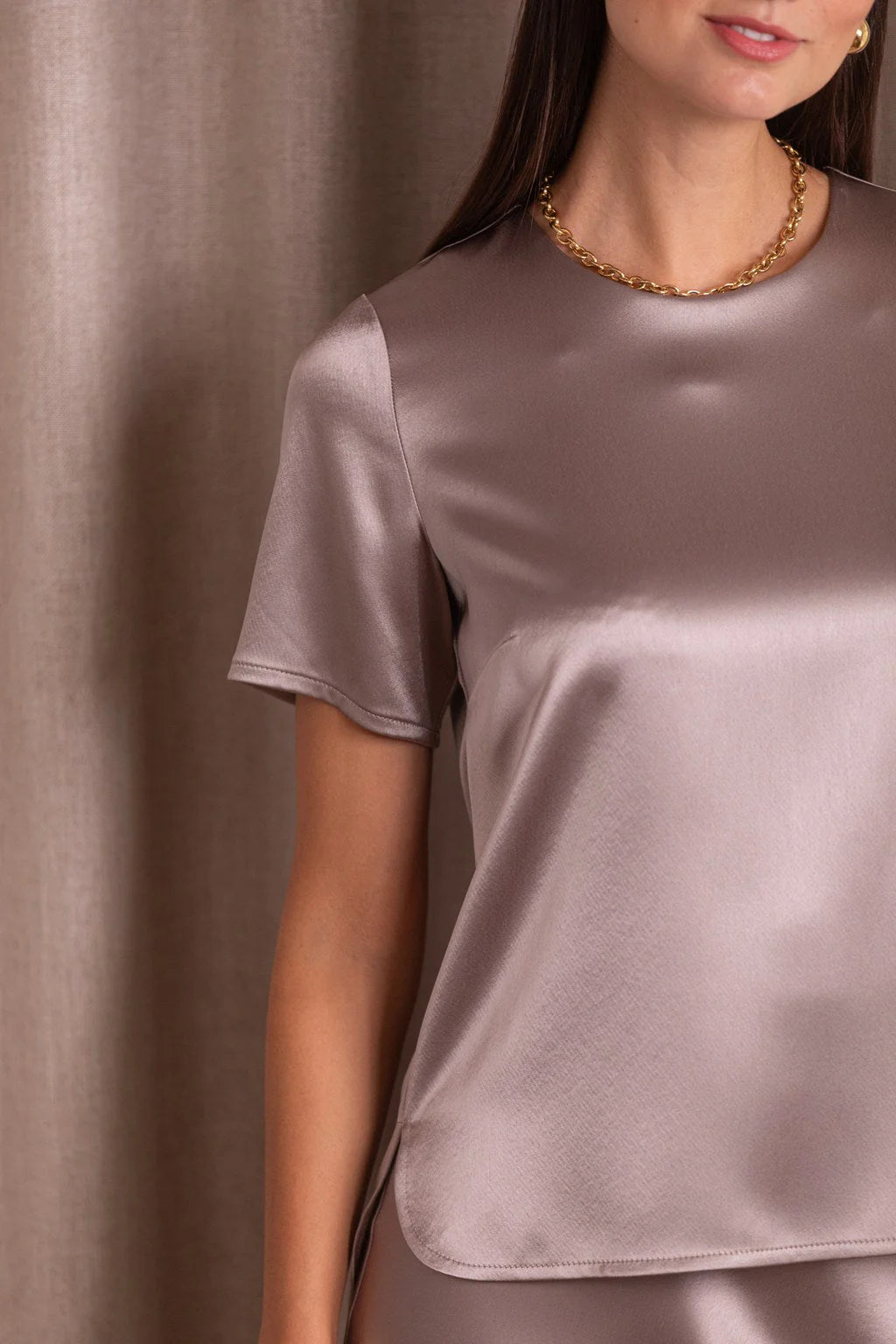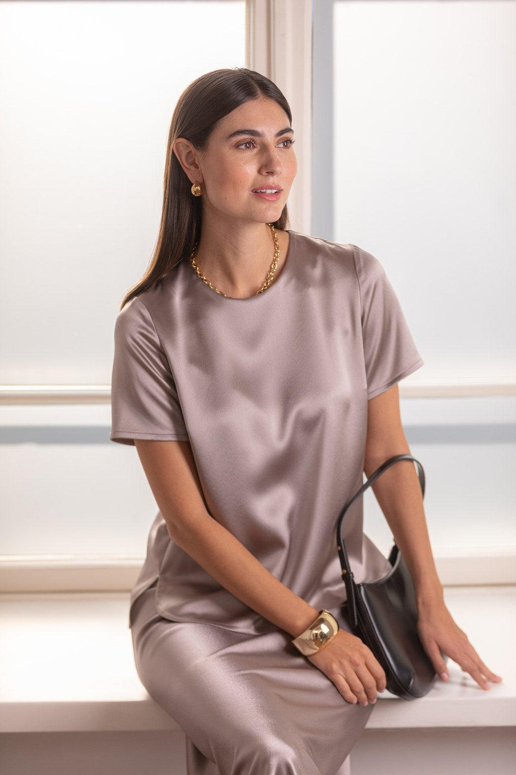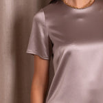 Lyhythihaisessa Tessa satiinipaidassa on suora malli, modernit sivuhalkiot ja nappikiinnitys pyöreässä kaula-aukossa. Japanissa kehitetty triasetaatti tekee paidasta pehmeän, kestävän ja silkintuntuisen, eikä se rypisty helposti. Nyt sesongin uudessa Nougat-sävyssä!