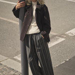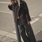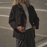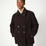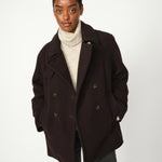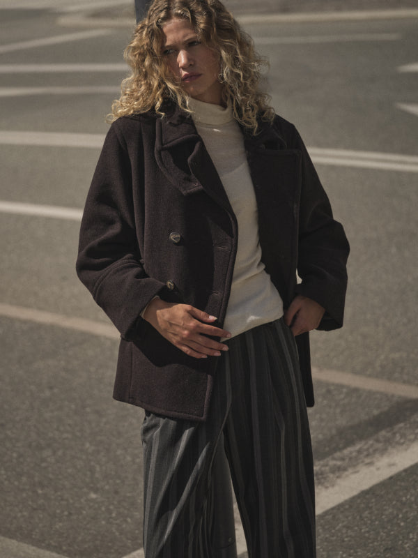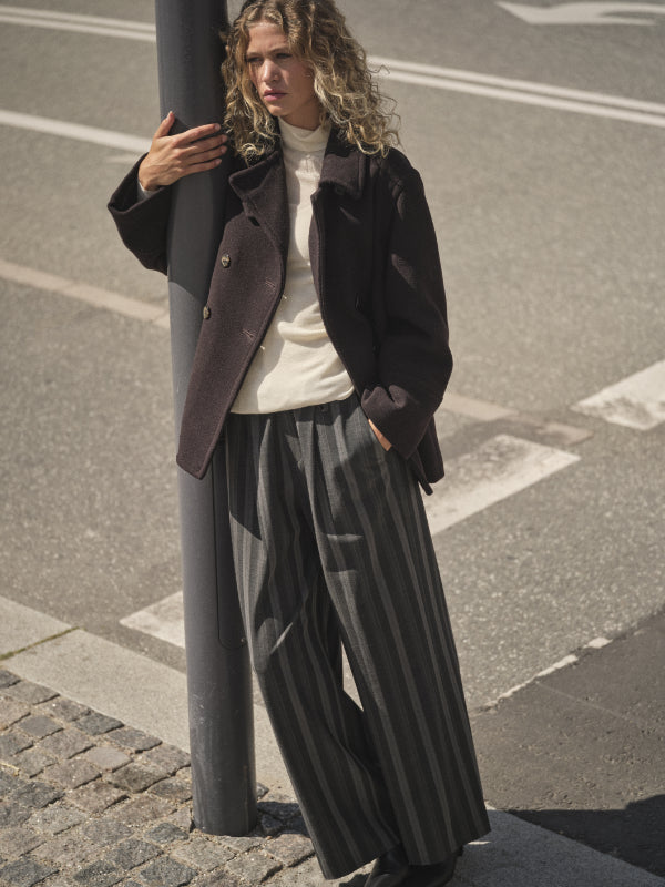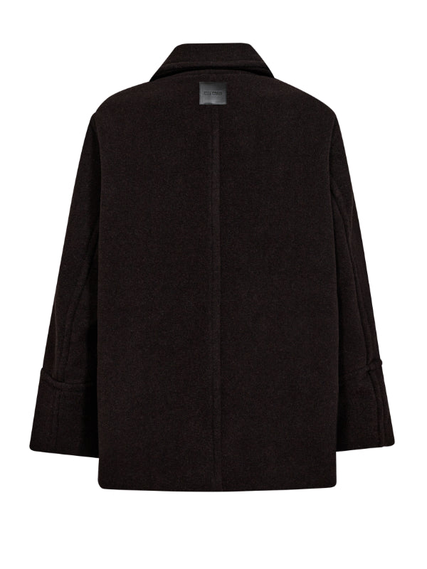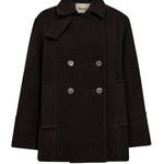 Elegantti suoralinjainen villakangastakki Mos Moshilta. Edessä kaksoisrivinapitus ja kauluksessa erillinen kaulusremmi. Hihoissa isot käänteet kivana yksityiskohtana. Villatakissa on kaunis tummanruskea sävy, joten se on helppo yhdistää erilaisten asujen kanssa. Rento istuvuus.