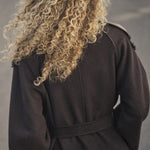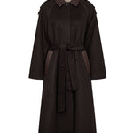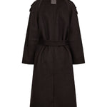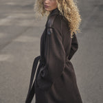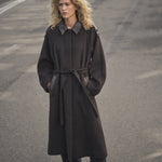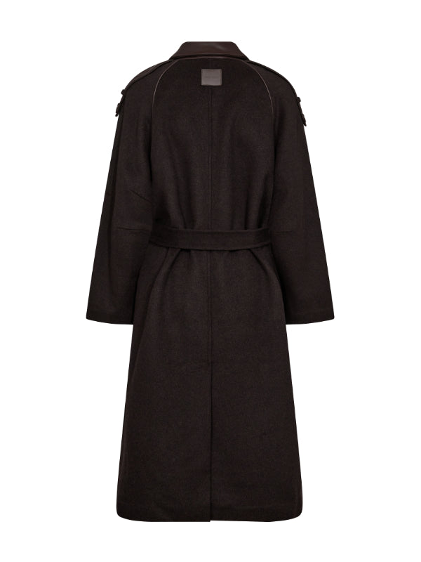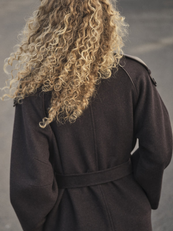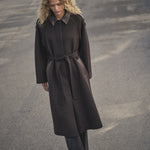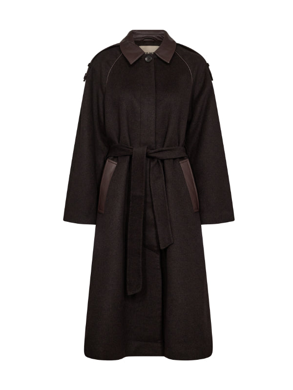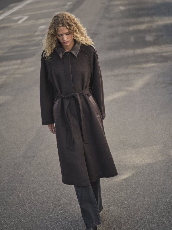 Mos Moshin tyylikäs ruskea villakangastakki kivoilla yksityiskohdilla. Edessä solmittava vyö ja nappikiinnitys. Nahkayksityiskohdat kauluksessa, taskuissa ja olkapäissä. Tämä pitkä takki on linjakas ja se on malliltaan midipituinen. Normimitoitus.