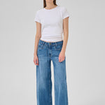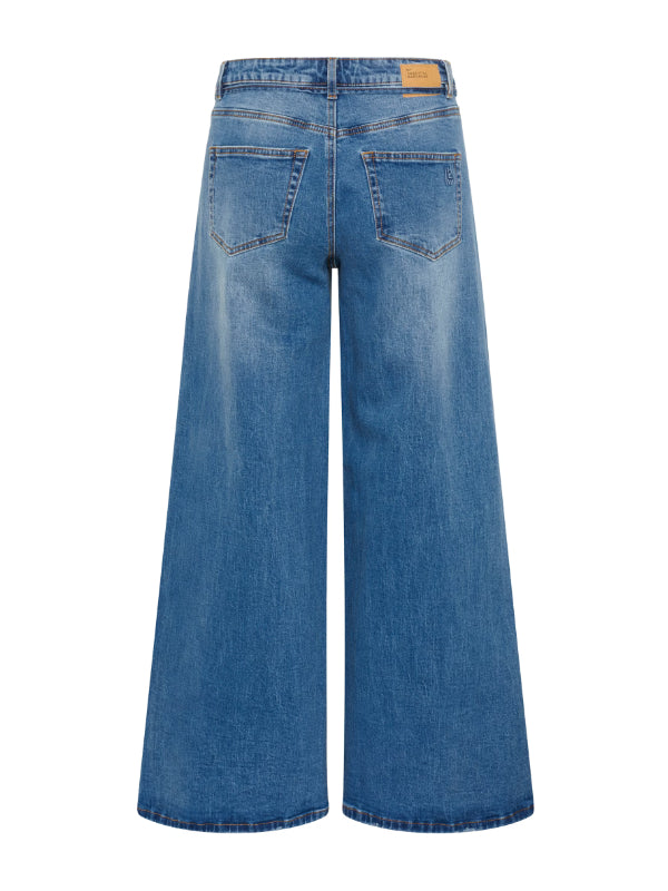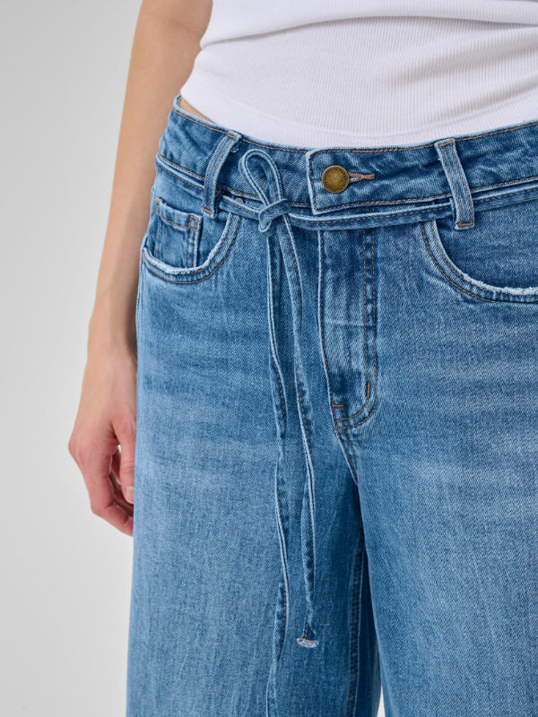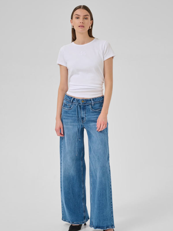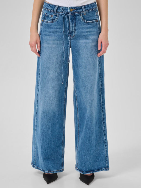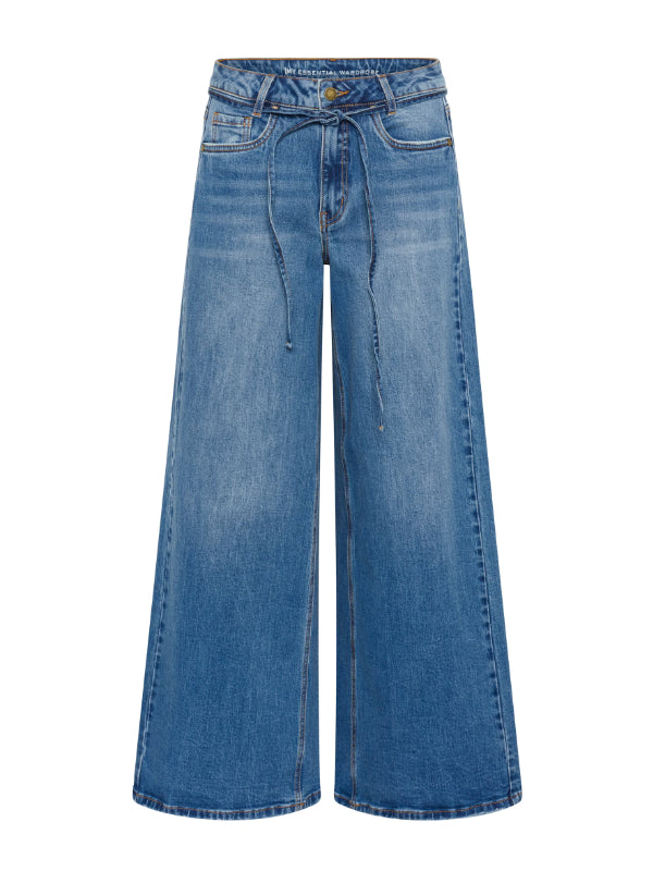 MEWin leveälahkeiset farkut, joissa vyötäröllä solmimisnyöri. Kiva pesty tummansininen sävy. Nämä farkut ovat ihanat päällä ja voit yhdistää ne helposti erilaisten yläosien kanssa. Valitse yksi koko suurempi koko kuin normaalisti, mikäli haluat rennomman lookin.