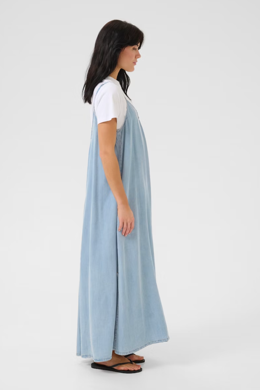 My Essential Wardroben rento maximekko farkkutyyliin! Laskeutuva lyocell tekee tästä mukavan kesämekon monenlaiseen käyttöön. Pue alle t-paita tai käy hellepäivänä sellaisenaan kepeiden sandaalien kanssa.