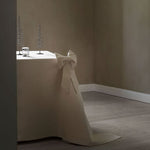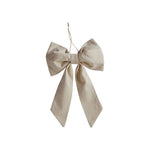 Tämän suuremman, vaalean rusetin kangas on kierrätettyä puuvillaa. Rusetissa solmimisnauha.