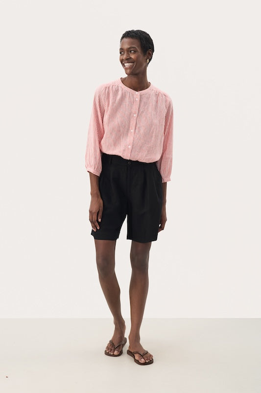 Part Twon ajattomat pellavasekoiteshortsit, joissa korkea vyötärö ja edessä laskokset lisäämässä istuvuutta. Nappikiinnitys ja vyölenkit. Mukava lahkeen pituus, joka ei paljasta liikaa.
