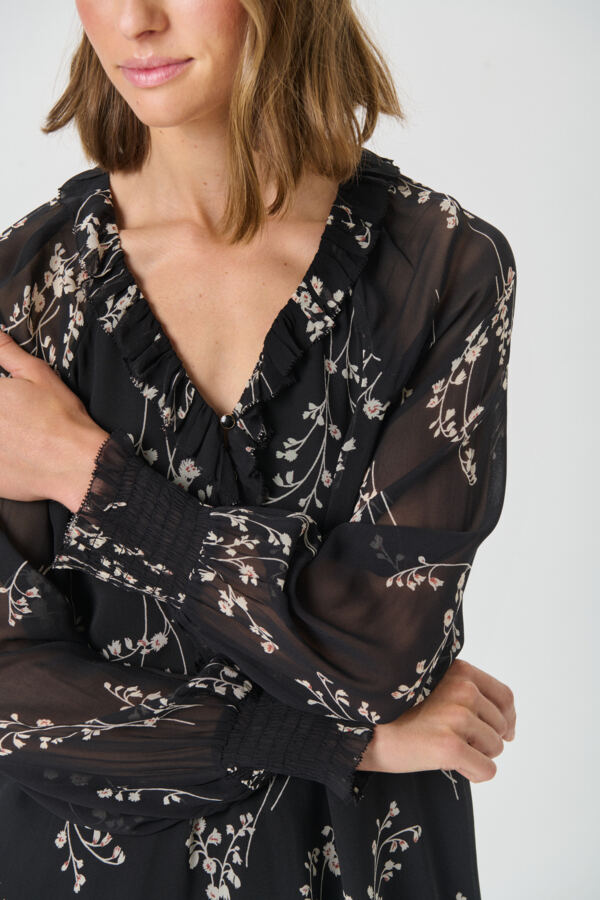 Mekossa on vuorikangas. Kiva läpikuultava kangas. V-kaula-aukko. Kaula-aukossa pieni frilla.