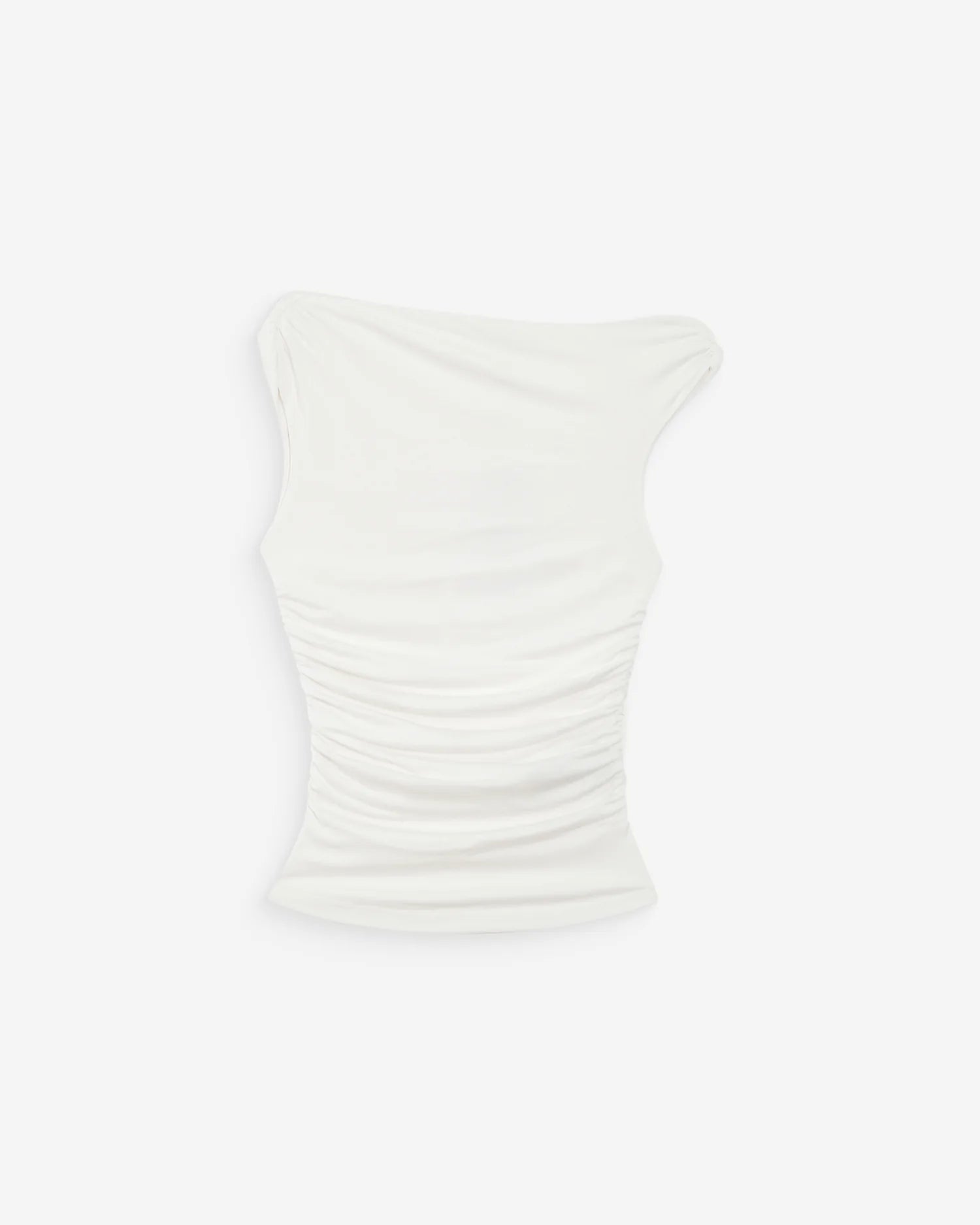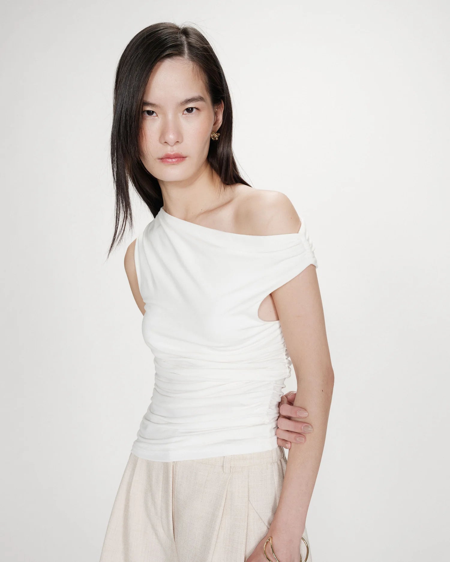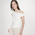 Grace&Milan kevään uutta: kaunis Vodia toppi naiselliseen tyyliin. Vodia toppi paljastaa toisen olkapään ja sopii monenlaiseen asukokonaisuuteen. Epäsymmetrinen, istuva malli. Vyötäröllä ja toisella olalla rypytys.